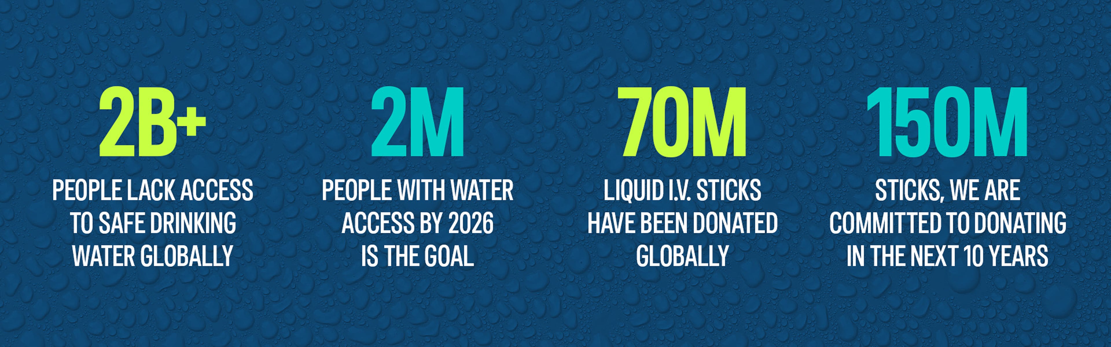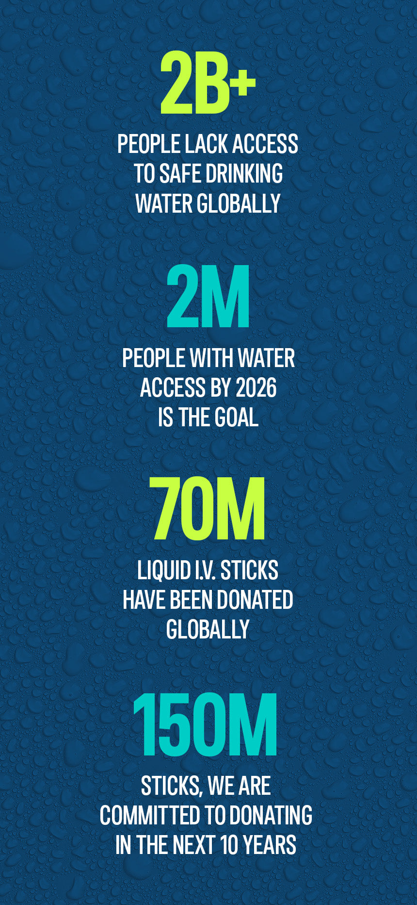 In 2015, Liquid I.V. donated 500 servings of its rehydration product to the Los Angeles Mission shelter to give hydration aid to its unhoused population. This small donation kicked off our hydration aid and product donation program and from there it scaled rapidly. Today, we partner with the world’s leading humanitarian organizations and have distributed over 36 million servings across the United States and over 40 countries. We are committed to donating an additional 150 million servings of Liquid I.V. by 2032.