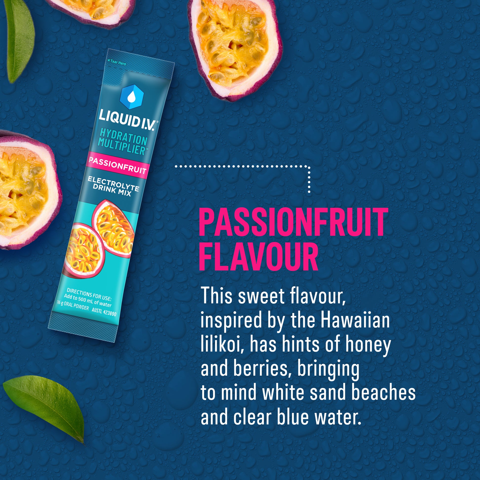 Enjoy the great taste of Liquid I.V.® Hydration Multiplier Passionfruit Electrolyte Drink Mix, a flavour inspired by the Hawaiian lilikoi, notes of honey & berry, evoking essence of tropical beaches.