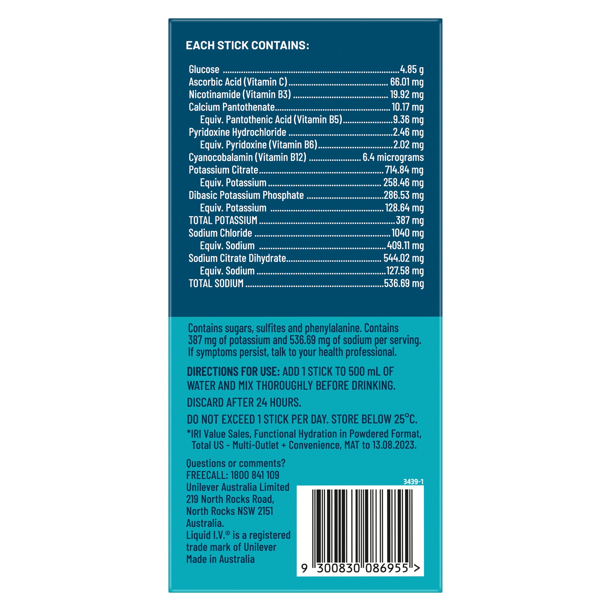 Each stick contains 4.85 g of glucose, 66.01 mg of ascorbic acid (Vitamin C), 19.92 mg of nicotinamide (Vitamin B3), 10.17 mg of calcium pantothenate providing 9.36 mg of pantothenic acid (Vitamin B5), 2.46 mg of pyridoxine hydrochloride providing 2.02 mg of pyridoxine (Vitamin B6), and 6.4 micrograms of cyanocobalamin (Vitamin B12). It also contains 714.84 mg of potassium citrate providing 258.46 mg of potassium, and 286.53 mg of dibasic potassium phosphate providing 128.64 mg of potassium, with a total potassium content of 387 mg. Additionally, it includes 1040 mg of sodium chloride providing 409.11 mg of sodium, and 544.02 mg of sodium citrate dihydrate providing 127.58 mg of sodium, for a total sodium content of 536.69 mg.