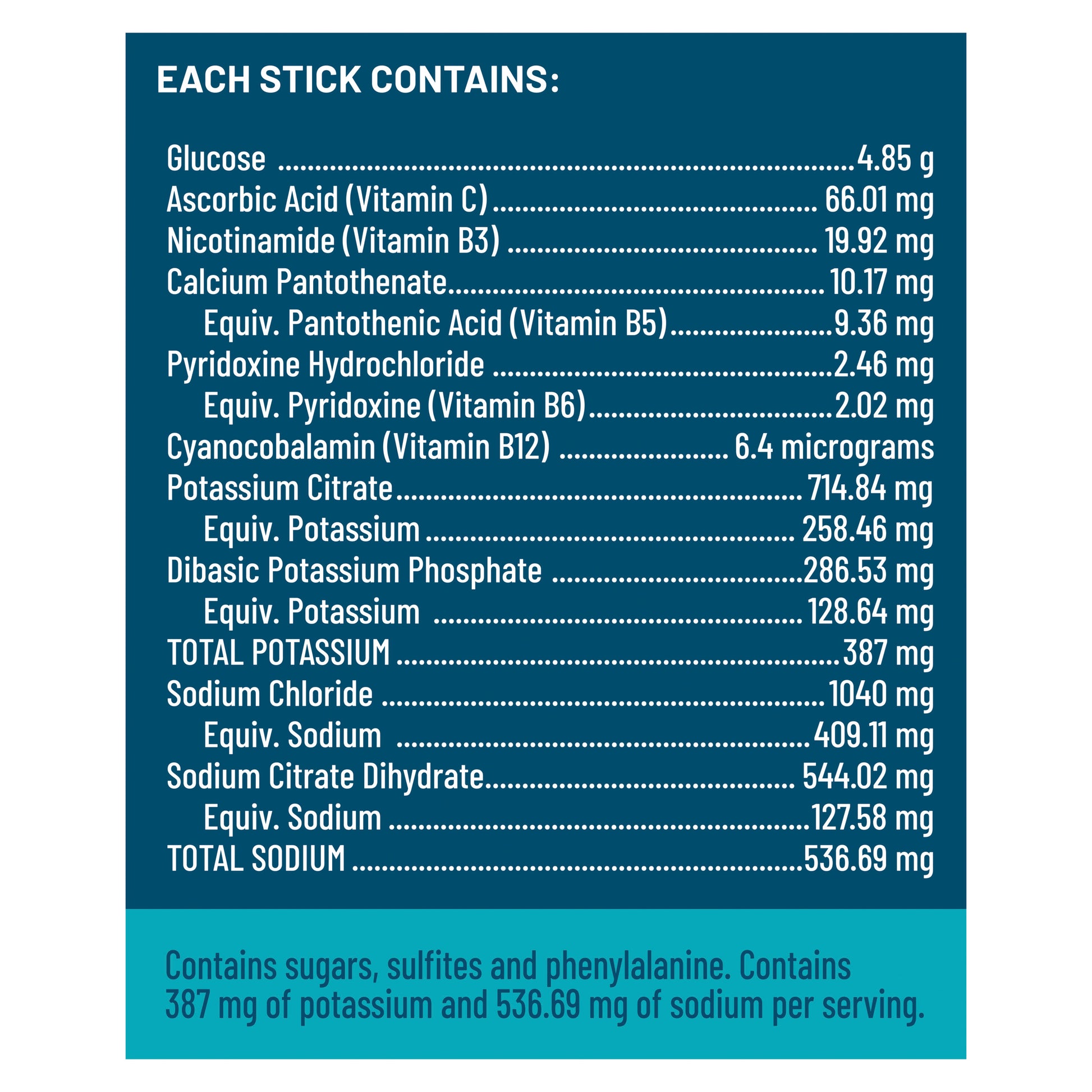 Each stick contains 4.85 g of glucose, 66.01 mg of ascorbic acid (Vitamin C), 19.92 mg of nicotinamide (Vitamin B3), 10.17 mg of calcium pantothenate providing 9.36 mg of pantothenic acid (Vitamin B5), 2.46 mg of pyridoxine hydrochloride providing 2.02 mg of pyridoxine (Vitamin B6), and 6.4 micrograms of cyanocobalamin (Vitamin B12). It also contains 714.84 mg of potassium citrate providing 258.46 mg of potassium, and 286.53 mg of dibasic potassium phosphate providing 128.64 mg of potassium, with a total potassium content of 387 mg. Additionally, it includes 1040 mg of sodium chloride providing 409.11 mg of sodium, and 544.02 mg of sodium citrate dihydrate providing 127.58 mg of sodium, for a total sodium content of 536.69 mg.