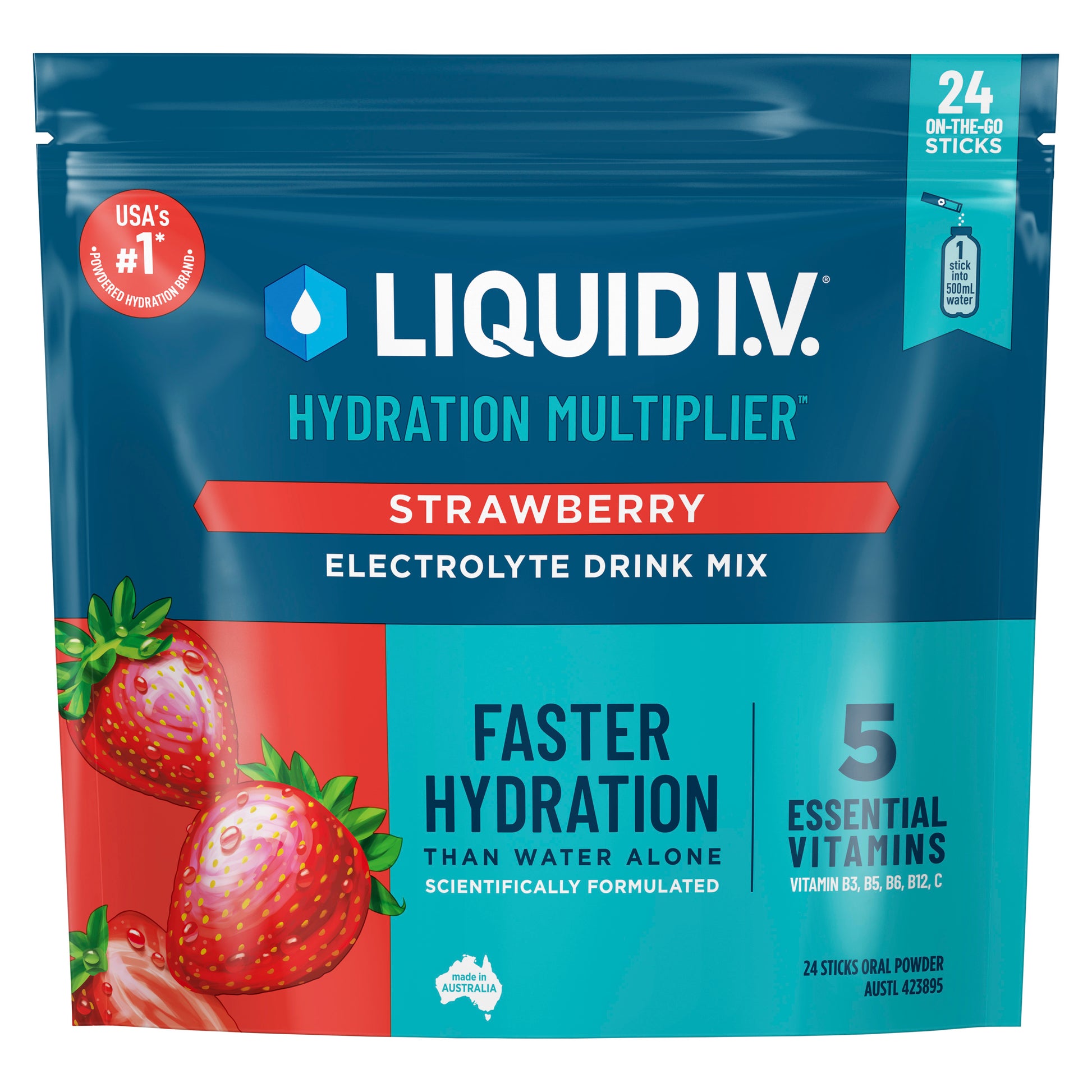 • Liquid I.V.® Hydration Multiplier Strawberry Electrolyte Drink Mix hydrates faster than water alone and is free from artificial colours and sweeteners.