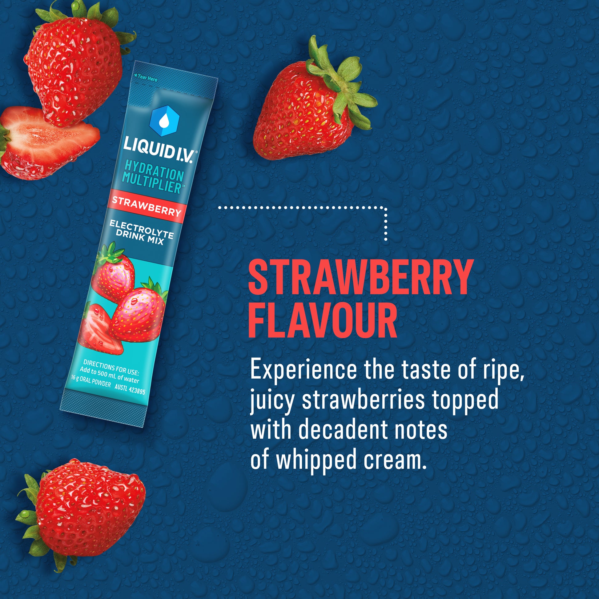Enjoy the great taste of Liquid I.V.® Hydration Multiplier Strawberry Electrolyte Drink Mix, a flavour of ripe, juicy strawberries topped with decadent notes of whipped cream.